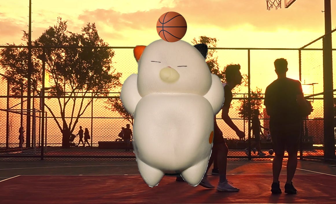 Winky, with his squishy exterior and wise heart, continues to be a beacon of positivity, reminding everyone that within the folds of life's complexities lie simple truths that can guide us. On this basketball court, a place of play and passion, Winky's message "Calmness is the cradle of power" becomes a mantra not just for the game, but for life itself.